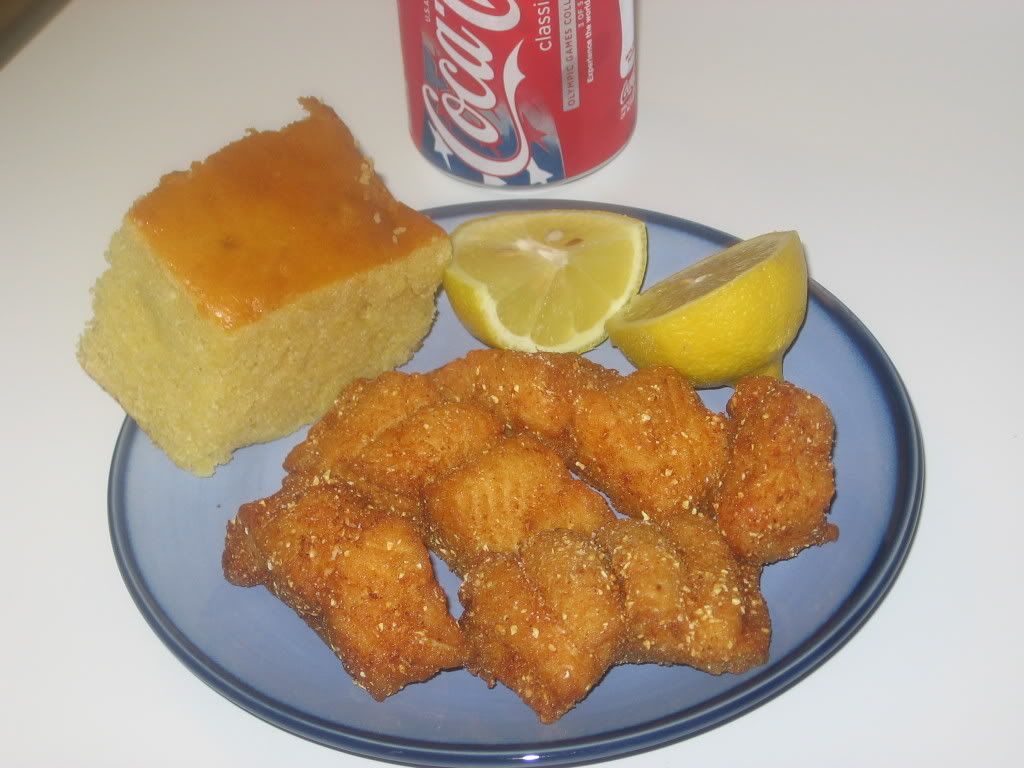 The catfish filets were cut up, coated in 50/50 mix of flour and cornmeal and deep fried. YUM.